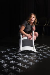 Mit diesem bedrückenden Bild im kargen Bühnenraum des Kammertheaters eröffnet Regisseurin Carola von Seckendorff den zweiten Teil ihrer Inszenierung „Prima Facie“ im Kleinen Bühnenboden. In der Hauptrolle des eindrucksvollen Solo-Stücks: Maria Goldmann.
